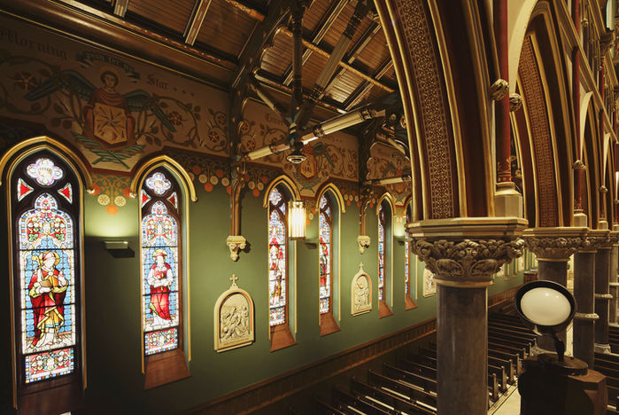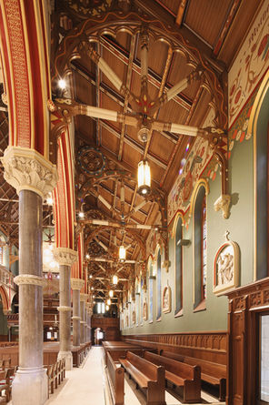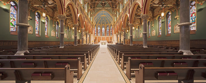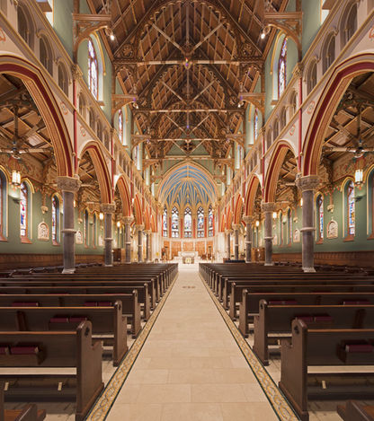 As is typical in a building this old, the interior had become fairly run down. John Tiedemann Inc. and Troy Simmons, Liturgical Architect of MPSB Architectural Design, were thereby commissioned by the Diocese of Syracuse to design and decorate the interior of the Cathedral. The work included stabilization of the side aisle plaster walls, decorative painting throughout the cathedral; restoration of the wood ceiling, extensive stenciling, restoration of the Stations of the Cross, and refinishing of all the architectural woodwork. After this work was completed, the Cathedral of the Immaculate Conception regained its old beauty and charm.