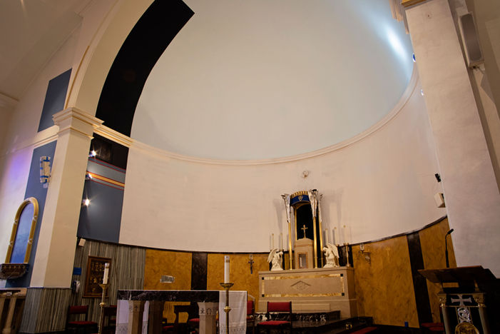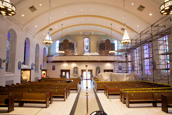 At Our Lady of Mount Virgin Church, John Tiedemann Inc. and Troy Simmons, Liturgical Architect of MPSB Architectural Design, conducted a complete interior paint scheme, performed plaster repairs, decorative painting, and a new mural of the Holy Spirit on the sanctuary ceiling. The church is now the pride of Garfield, New Jersey.
