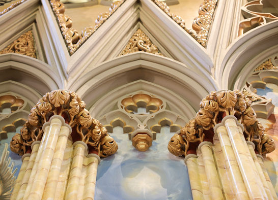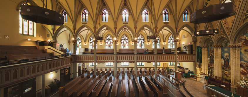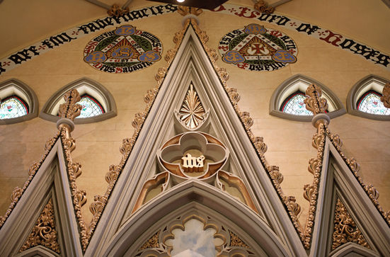 A full art conservation program ensued, including paint recovery, consolidation treatment of the wood lath and plaster ceiling, paint removal that exposed the original paint schemes, complete interior painting, decorative painting, in-painting of historic decorative painting on the sanctuary walls, and replication of the original decorative plaster. This plaster treatment and painting program was successfully carried out by John Tiedemann Inc. & HPCS USA. St. Brigid’s Church will live on in great splendor for many years to come.